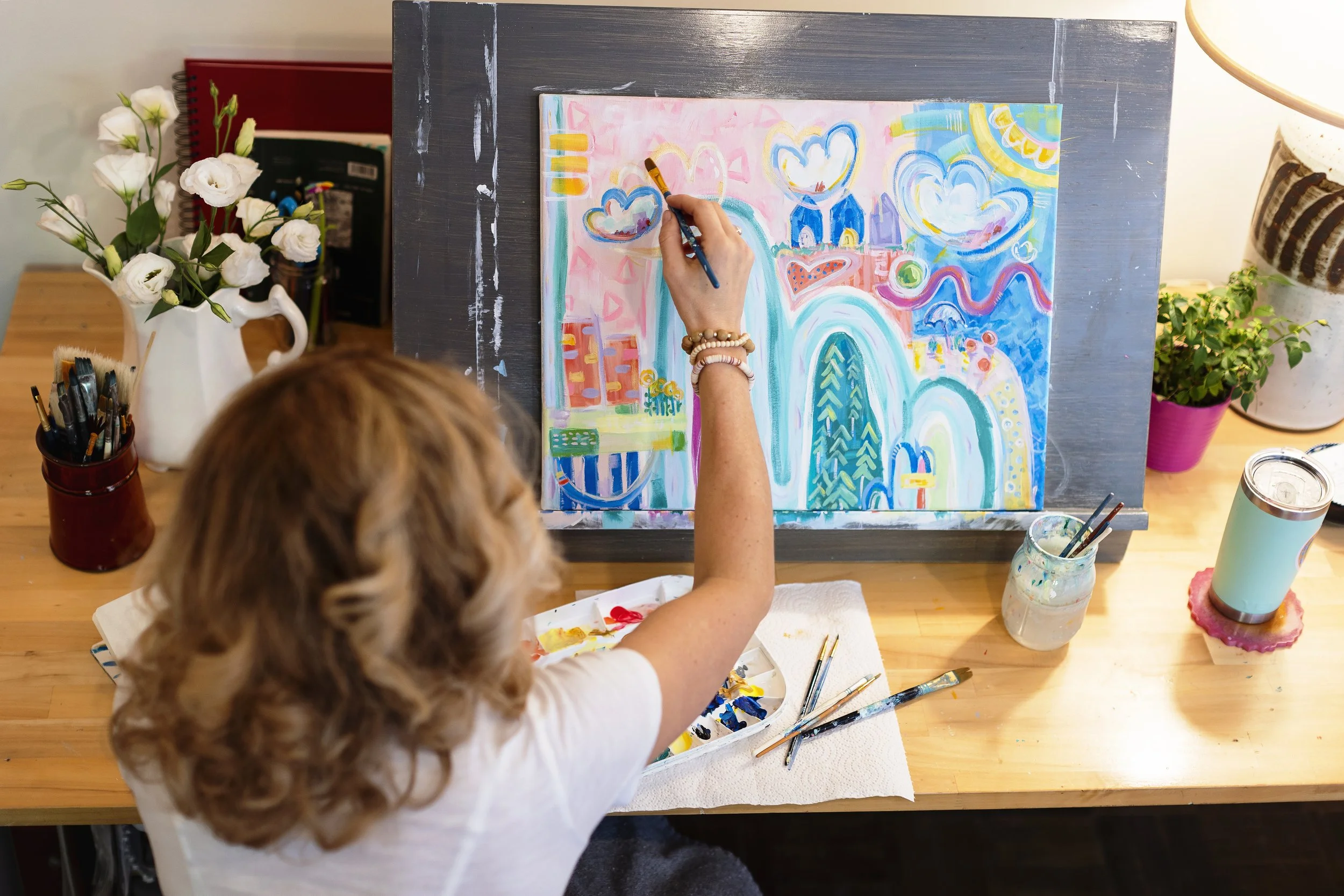 Heather Harrington is an artist, designer, and creative entrepreneur living in Traverse City, Michigan with her husband, and three daughters. After leading her own design agency for over 20 years as Creative Director and working with top national brands, Heather transitioned her focus to the fine arts. As the founder of Life and Whim, she now channels her creative energy into painting expressive, vibrant works that bring joy and connection to others.