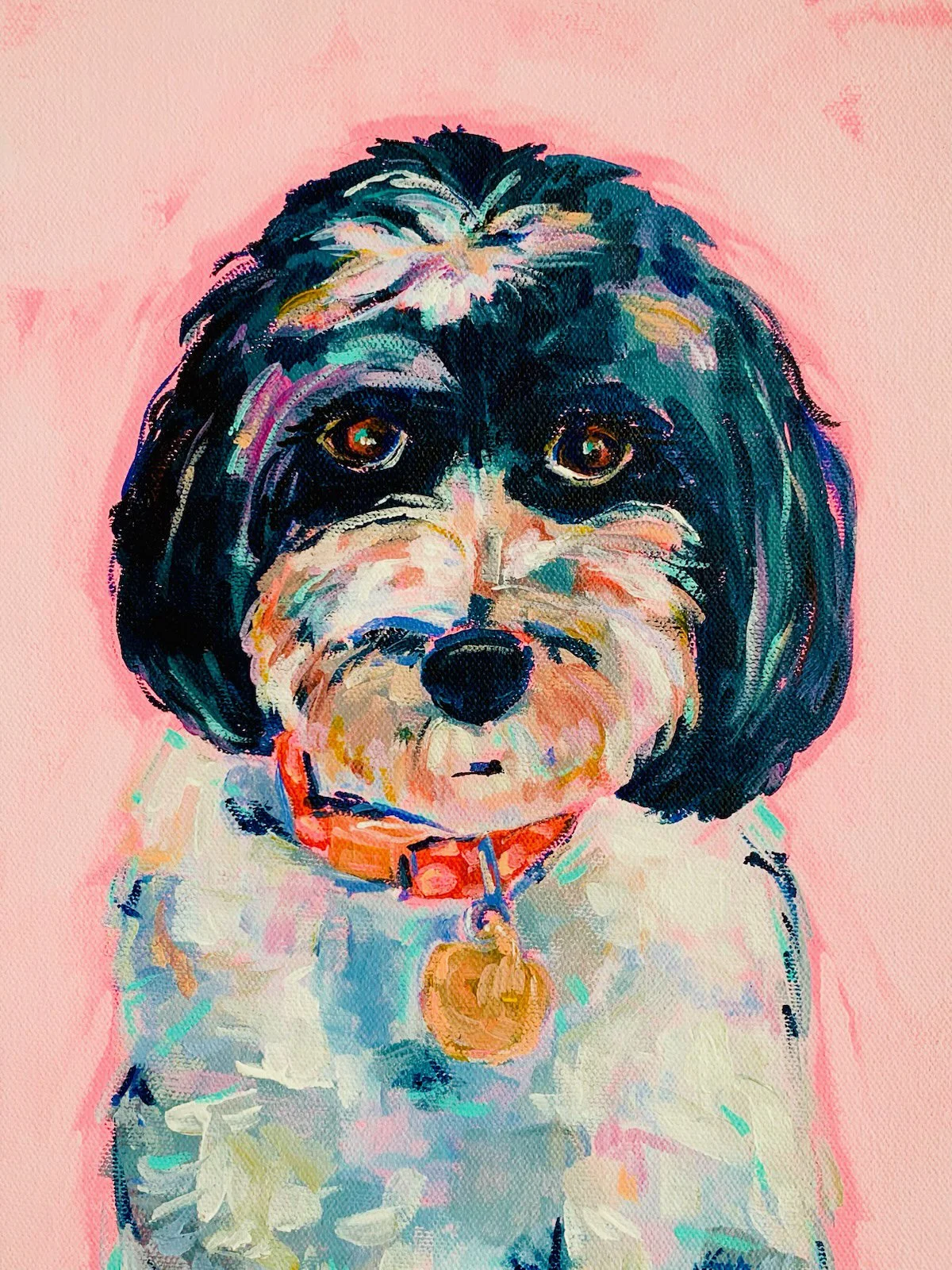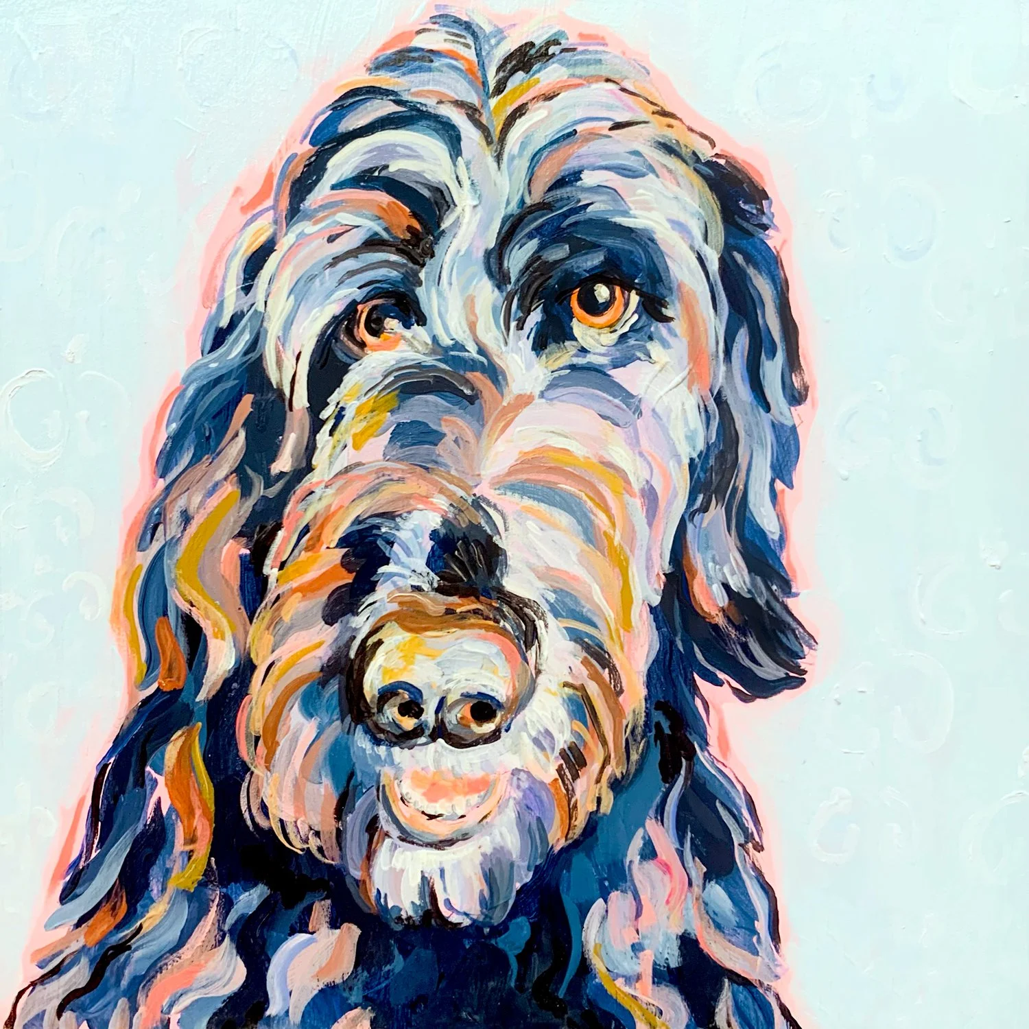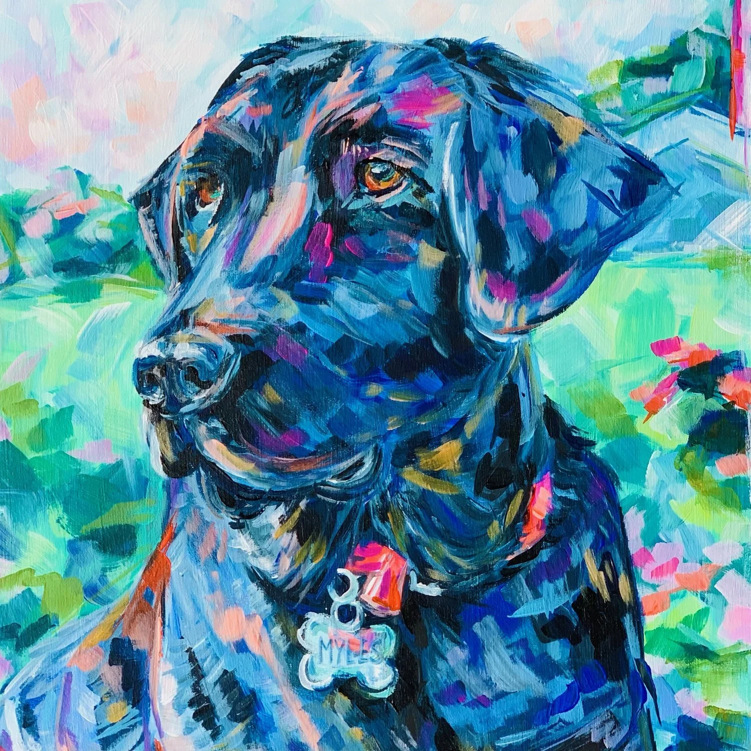 Celebrate your love for your furry friend with a custom pet portrait painted in Heather’s signature vibrant, joyful style.