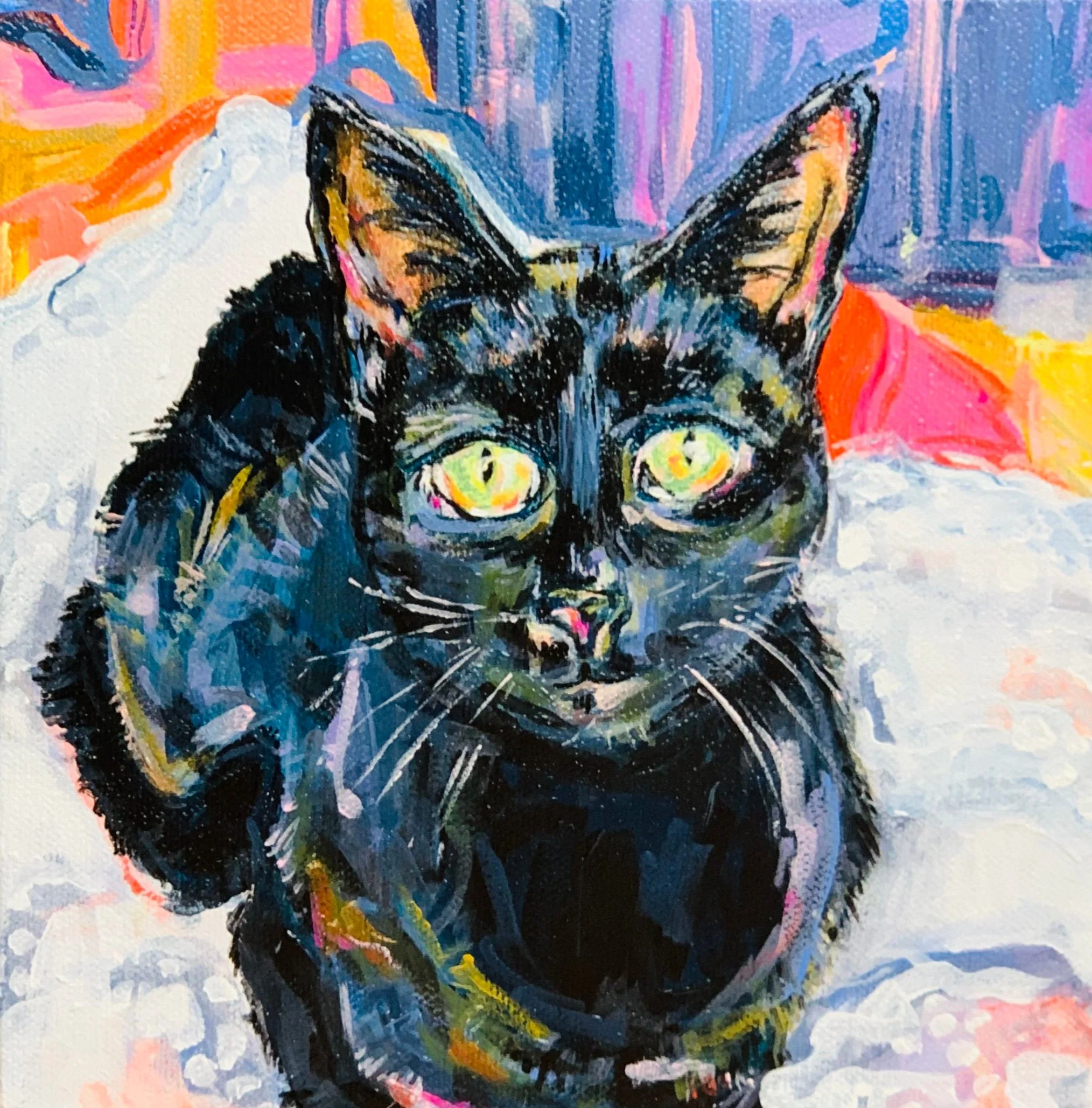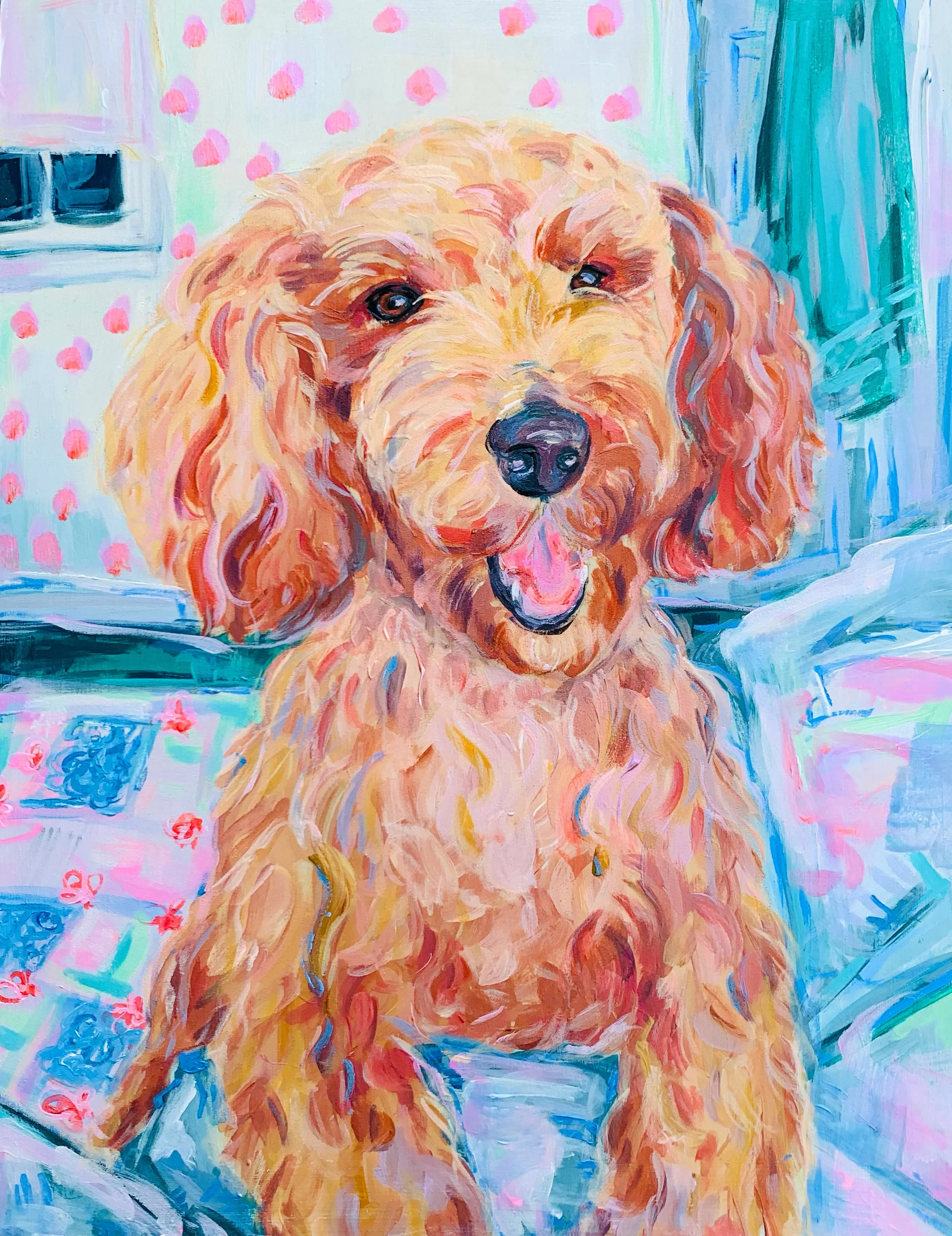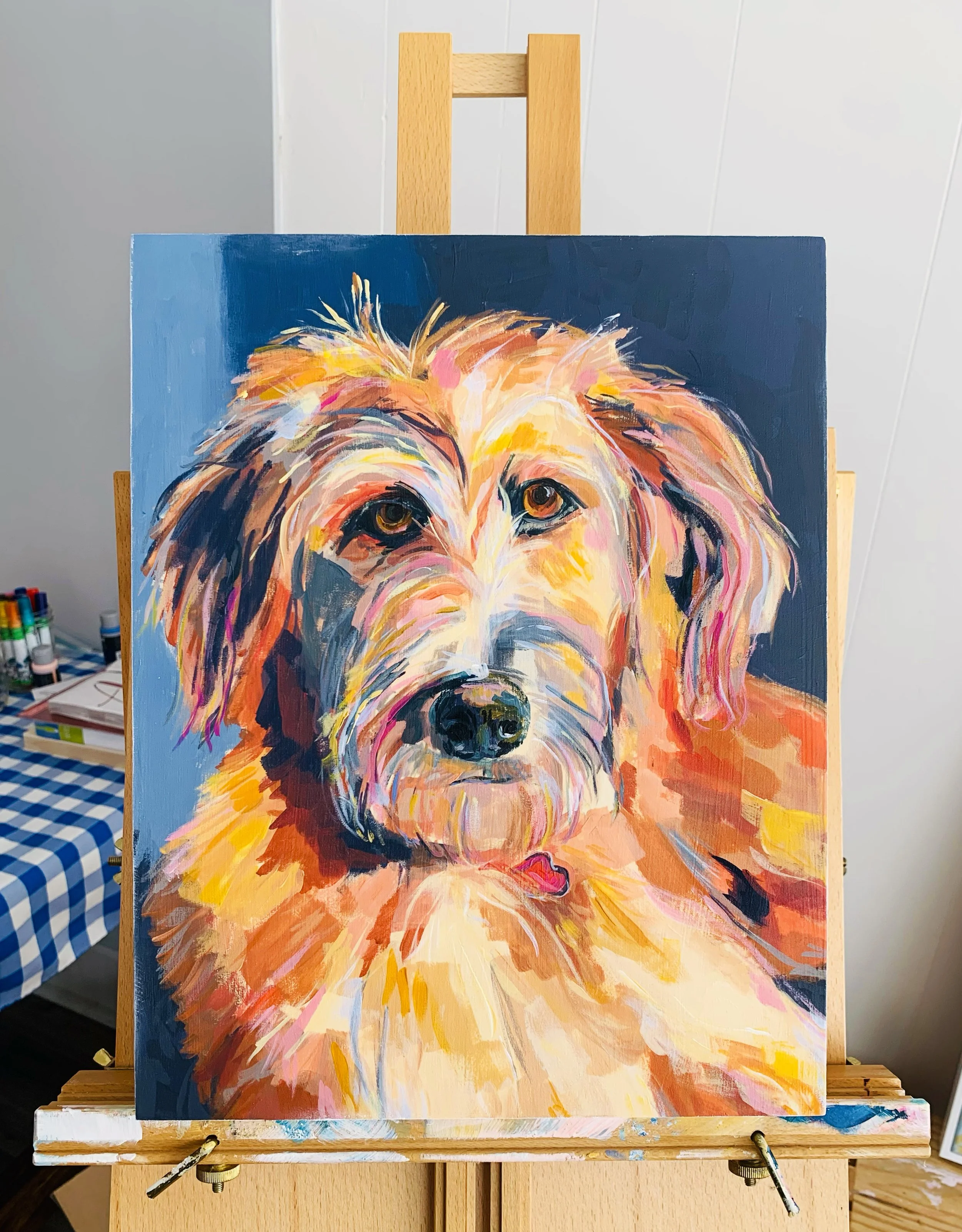 Celebrate your love for your furry friend with a custom pet portrait painted in Heather’s signature vibrant, joyful style.